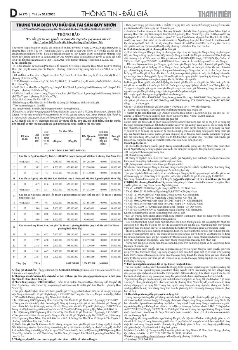 Thông báo đấu giá tài sản Quyền sử dụng đất ở tại các khu quy hoạch dân cư (đợt 2, năm 2025) trên địa bàn phường Hoài Nhơn Tây - lần 1