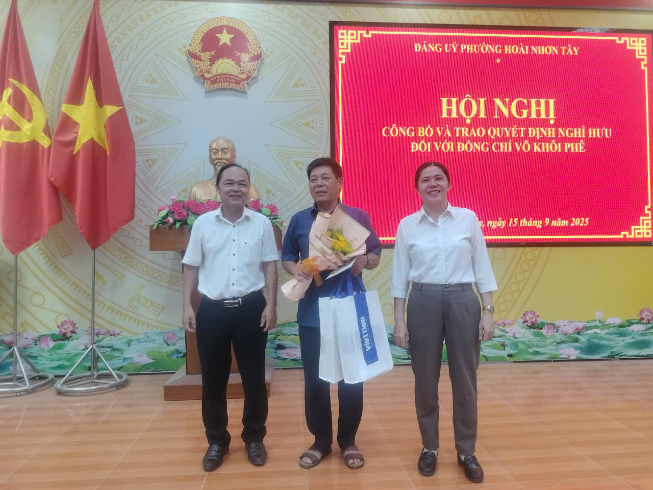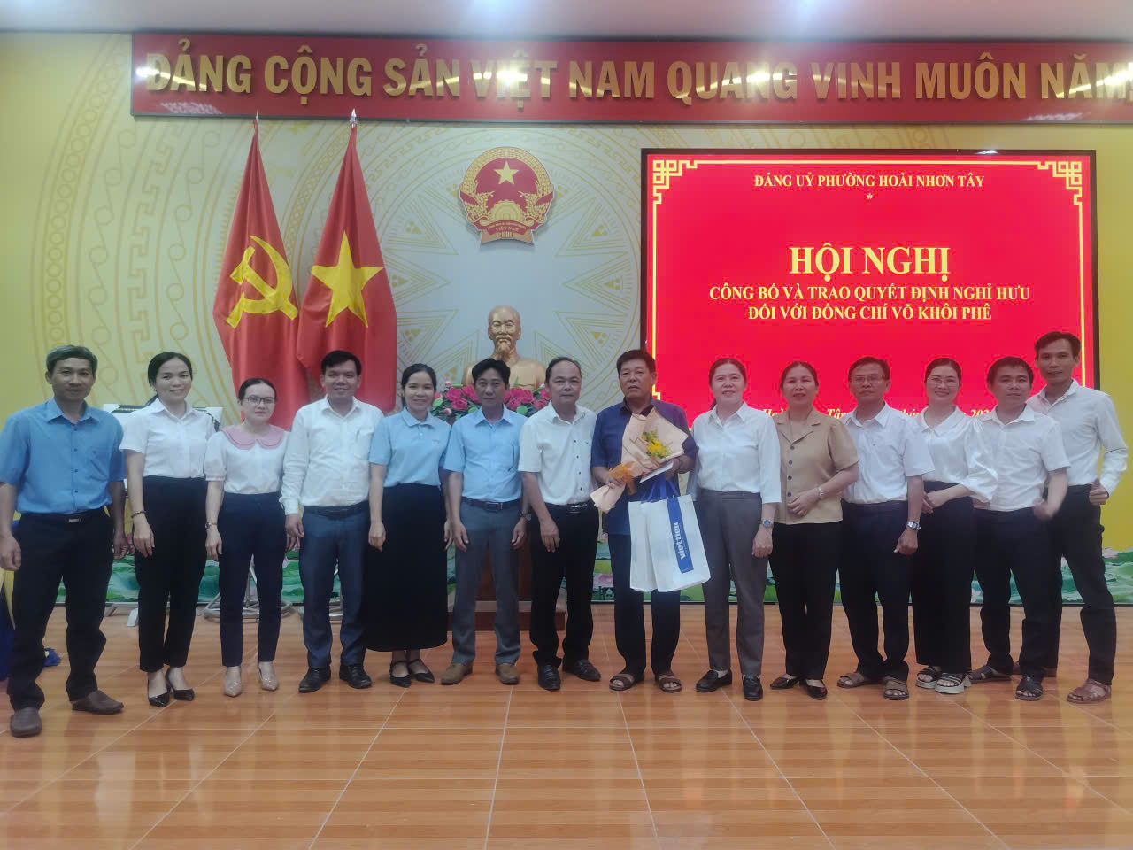 Tại hội nghị, lãnh đạo Đảng ủy phường đã công bố và trao Quyết định nghỉ hưu theo chế độ và ghi nhận những đóng góp quan trọng của đồng chí Võ Khôi Phê trong suốt quá trình công tác. Với tinh thần trách nhiệm, tận tụy, đồng chí đã có nhiều đóng góp thiết thực trong xây dựng và phát triển phường Hoài Nhơn Tây, góp phần vào công cuộc xây dựng Đảng, chính quyền và phát triển kinh tế - xã hội địa phương.
