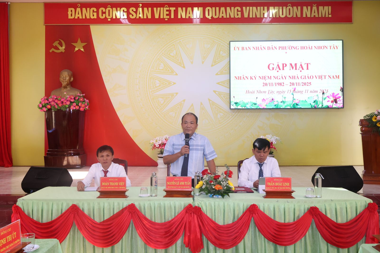 Phát biểu tại buổi lễ, Đồng chí Nguyễn Lê Anh Tuấn – Chủ tịch UBND phường Hoài Nhơn Tây bày tỏ lòng biết ơn sâu sắc đối với những đóng góp của đội ngũ thầy cô giáo trong suốt thời gian qua. Dù còn nhiều khó khăn về cơ sở vật chất và điều kiện giảng dạy, nhưng đội ngũ giáo viên luôn nêu cao tinh thần trách nhiệm, tận tâm với nghề, góp phần quan trọng nâng cao chất lượng giáo dục toàn diện của phường. Lãnh đạo phường cũng gửi lời chúc mừng tốt đẹp nhất đến các thầy cô nhân dịp 20/11, đồng thời mong muốn đội ngũ nhà giáo tiếp tục phát huy truyền thống, gương mẫu, đổi mới phương pháp giảng dạy, đáp ứng yêu cầu đổi mới giáo dục hiện nay.