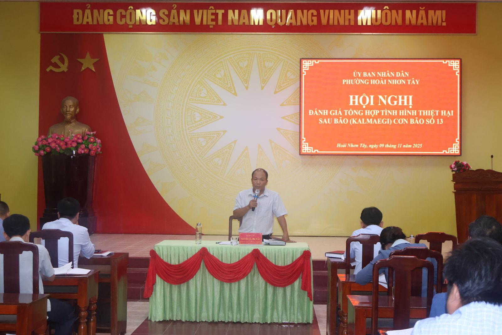 Phát biểu tại hội nghị, đồng chí Nguyễn Lê Anh Tuấn nhấn mạnh, bão KALMAEGI là cơn bão mạnh, diễn biến phức tạp, ảnh hưởng trực tiếp đến nhiều tỉnh thành miền Trung, trong đó có phường Hoài Nhơn Tây. Trước diễn biến khó lường của bão, UBND phường đã chủ động kích hoạt phương án phòng chống, tổ chức ứng trực 24/24, triển khai đồng bộ các biện pháp rà soát khu dân cư, di dời hộ dân trong vùng nguy hiểm, chằng chống nhà cửa, cắt tỉa cây xanh, tuyên truyền cảnh báo đến từng hộ dân, nhờ vậy đã hạn chế thấp nhất thiệt hại.